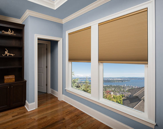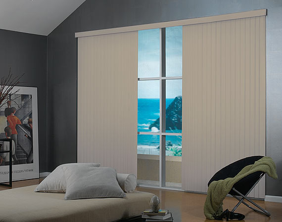 Verticals aren’t the only choice for sliding glass doors anymore! Panel track window treatments allow for decorative roller shades, naturally beautiful woven woods, energy-efficient cellular shades, or practical screen shades to be used in a vertical application. Ideal for sliding glass doors or for use as a room divider, panel tracks allow for a much wider array of options, and a highly customized window treatment for your space.